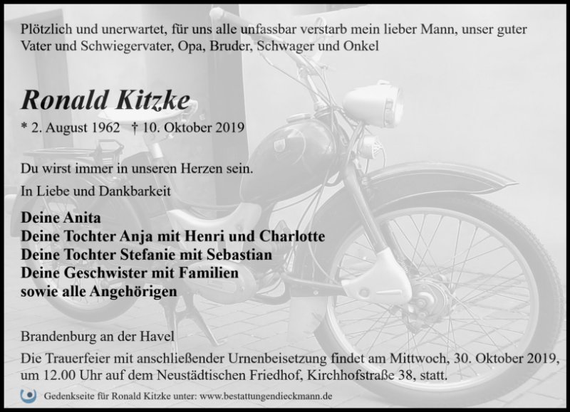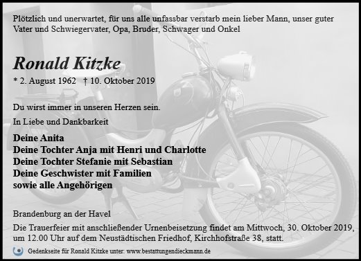 Seid stark. Ronald würde sich das wünschen. An Ihn denken, von ihm sprechen.. er ist damit unvergessen.