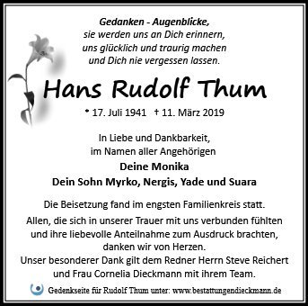dieser Abschied scheint so endgültig. Unsere Online Gedenkseite soll Ihnen und Ihren Erinnerungen ein Raum geben. Einen Raum für Worte, Bilder oder für eine stille Kerze. So werden die vielen unterschiedlichen Gedanken zum Dahinscheiden Ihrer Verstorbenen weiter getragen und bleiben im Kreise der Familie und Ihrer Freunde erhalten.