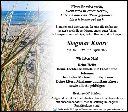 gestorben am 5. April 2020 in Beetzsee OT Brielow