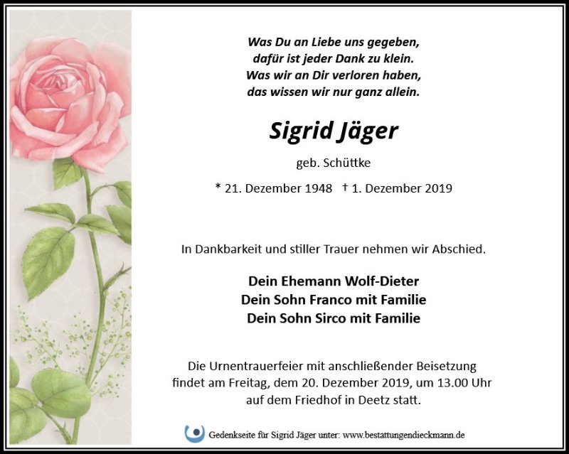 wir wünschen Ihnen für die kommende Zeit viel Kraft und dass es Ihnen gelingt, dankbar auf die positiven Erinnerungen zurückzublicken. Diese Gedenkseite möge Ihnen dabei helfen, Ihre Trauer zu teilen und das Andenken gemeinsam wachzuhalten.