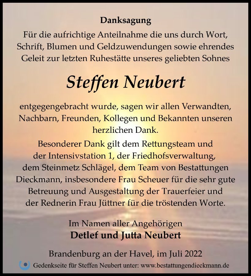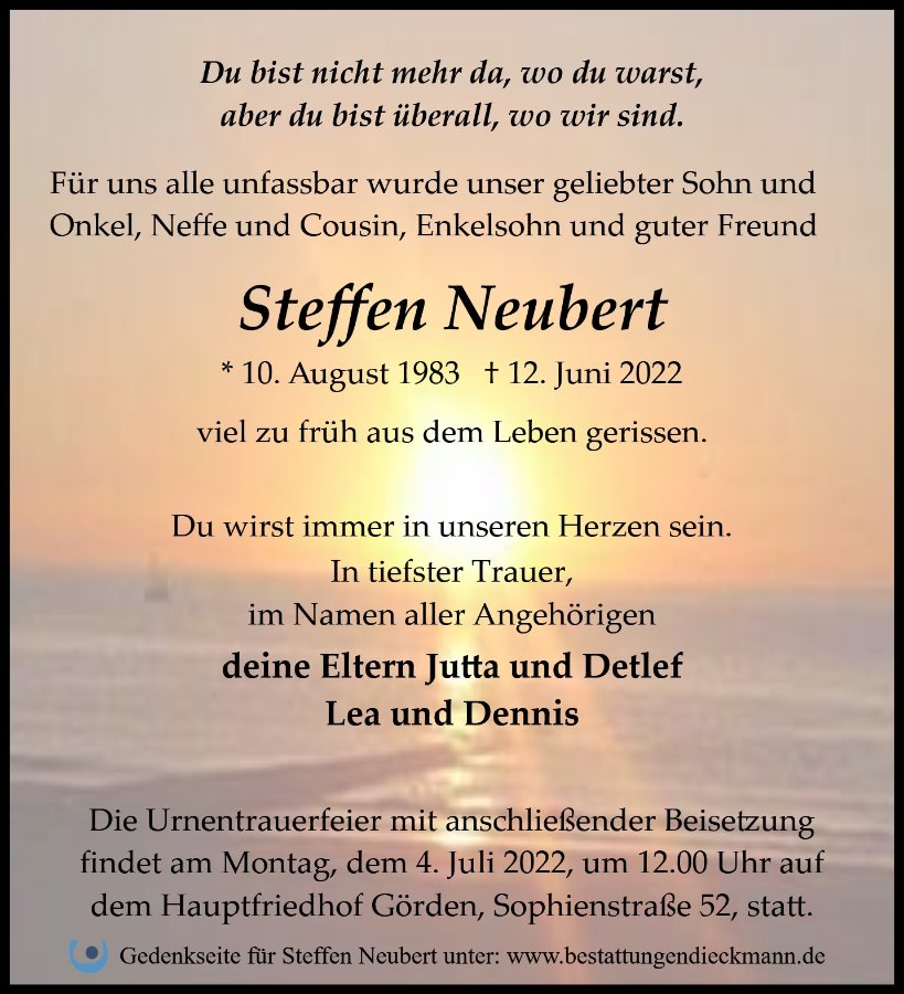 Die Erinnerung ist das Fenster ,durch das wir dich sehen können, wann immer wir wollen. Was uns bleibt sind liebevolle Erinnerungen. Aus unserem Herzen wirst du niemals gehen .Wir nehmen schweren Herzens Abschied von dir lieber Steffen .In Liebe Onkel Reiner und Tante Geli Sven und Sylke mit Emily, Anja und Andre mit Tamia und Luca