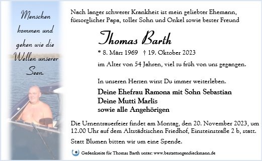 Liebe Ramona und lieber Basti, am 20.11.2023 haben wir gemeinsam unserem Thomi die letzte Ehre erwiesen. Danke, dass wir diesen Tag mit Euch gemeinsam verbringen durften. Es war ein so würdevoller Abschied. Lieben Dank!