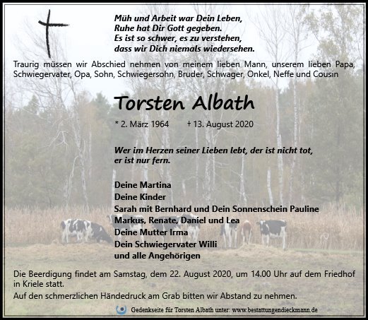 Alles Gute zum Geburtstag lieber Torsten. Wir kommen dich nachher besuchen. Du fehlst uns.