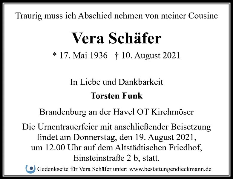 Der Tod von Vera Schäfer hat mich und viele andere ehemaligen Kollegen aus der ZPEV Kirchmöser außerordentlich berührt.