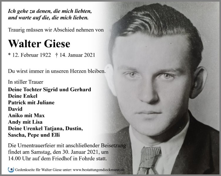 in diesen Tagen fühlen wir mit Ihnen und wünschen Ihnen von Herzen, dass Sie aus den glücklichen Erinnerungen Kraft schöpfen, um positiv in die Zukunft zu gehen. Diese Gedenkseite möge Ihnen dabei helfen, Ihre Trauer zu teilen und das Andenken gemeinsam wachzuhalten.