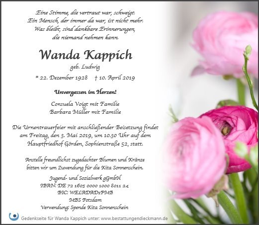 Liebe Familie von Wanda Kappich,