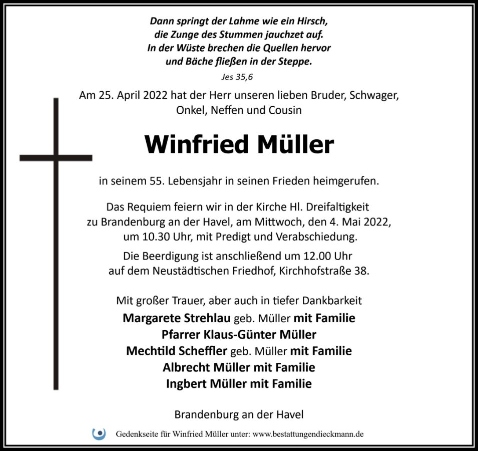 Liebe Familie Müller, wir haben gelesen, dass Winfried gestorben ist. Wir möchten Ihnen allen unser aufrichtiges Beileid aussprechen. Gerne erinnern wir uns an Ihn, vor allem an seine liebe, freundliche Art und an sein Lächeln im Gesicht. Möge er in Frieden ruhen. Wir sind im Gebet mit Ihnen allen verbunden.