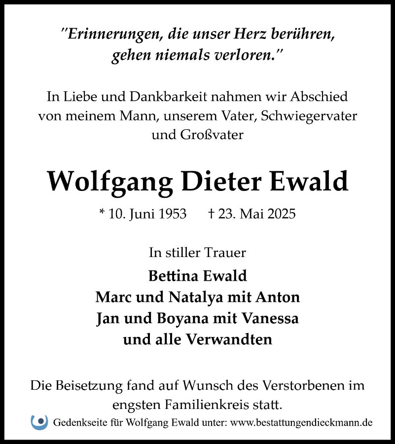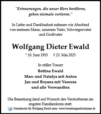 in diesen Tagen fühlen wir mit Ihnen und wünschen Ihnen von Herzen, dass Sie aus den glücklichen Erinnerungen Kraft schöpfen, um positiv in die Zukunft zu gehen. Diese Gedenkseite möge Ihnen dabei helfen, Ihre Trauer zu teilen und das Andenken gemeinsam wachzuhalten.