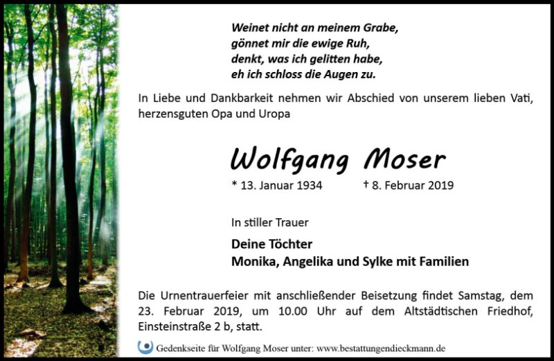 Niemand kann Ihnen den Schmerz abnehmen, aber für diese Zeit hoffe ich, dass diese Gedenkseite dazu beiträgt, gemeinsame Erinnerungen zu teilen. Erlebnisse die Sie hatten, können in der Erinnerung noch mal aufleben und vielleicht den einen oder anderen schönen Moment wieder erscheinen lassen. Ob in Form einer stillen Kerze, einem schönem Gedicht oder einem gemeinsamen Bild.