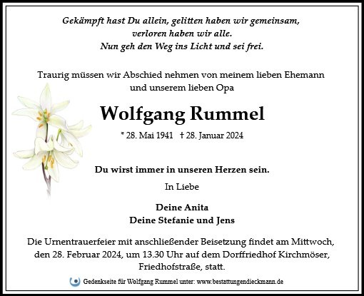 in dieser Zeit des Schmerzes wünschen wir Ihnen Kraft, den Verlust im Kreise Ihrer Liebsten zu verarbeiten. Als Zeichen unserer Anteilnahme und des Gedenkens entzünden wir dieses erste Licht. Möge diese Gedenkseite Ihnen helfen, Erinnerungen zu teilen und so das Andenken gemeinsam wachzuhalten.